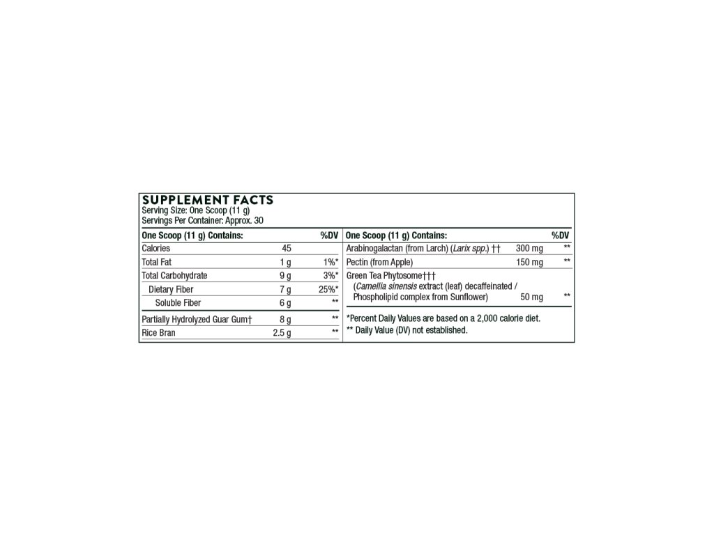 Základom je čiastočne hydrolyzovaná guarová guma (Sunfiber®), ktorá sa vďaka svojej upravenej forme lepšie rozpúšťa a je šetrnejšia k tráveniu. Dopĺňa ju arabinogalaktán, prírodná vláknina zo smrekovca, a pektín z jabĺk, známy z ovocných šupiek. Ryžové otruby zabezpečujú rastlinný zdroj vlákniny bez lepku a zelený čaj Phytosome® (bez kofeínu) prináša výnimočne dobre vstrebateľné polyfenoly.